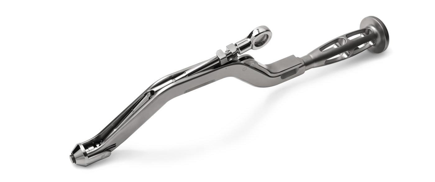 L'impacteur ou porte-cupule décalé permet un positionnement contrôlé et un impact des cotyles par petite incision (MIS).